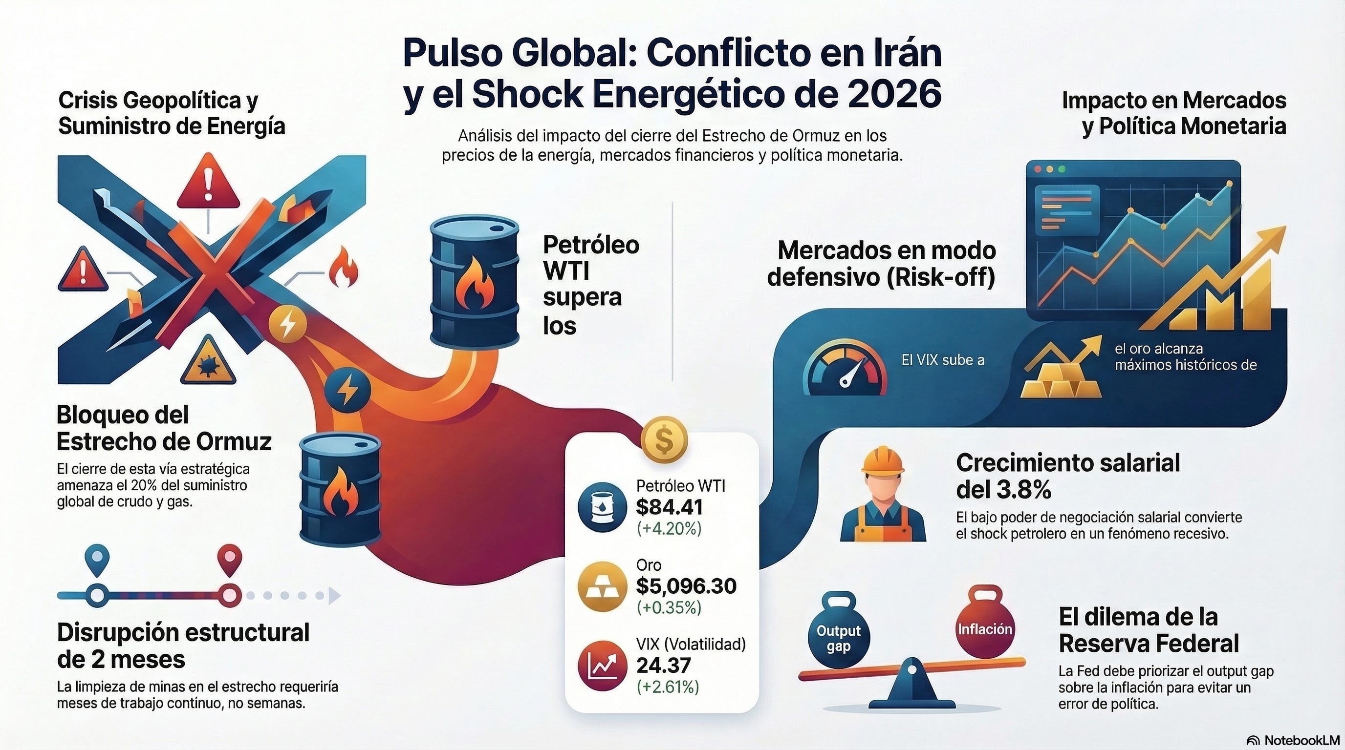 El segundo orden de la política monetaria: Los shocks de oferta —como el petrolero— normalmente elevan la inflación vía costos, pero en un mercado laboral sin poder de negociación (3.8% de wage growth vs 6.8% en 2022), el efecto de segundo orden es recesivo, no inflacionario. La Fed debe mirar el output gap, no el headline CPI. El timing importa: si el conflicto se prolonga, habrá que monitorear si Powell/Warsh priorizan anclar las expectativas (mantener las tasas altas temporalmente) o sostener la actividad (recortes anticipados para compensar el drag energético). Horizonte: 8-12 semanas.