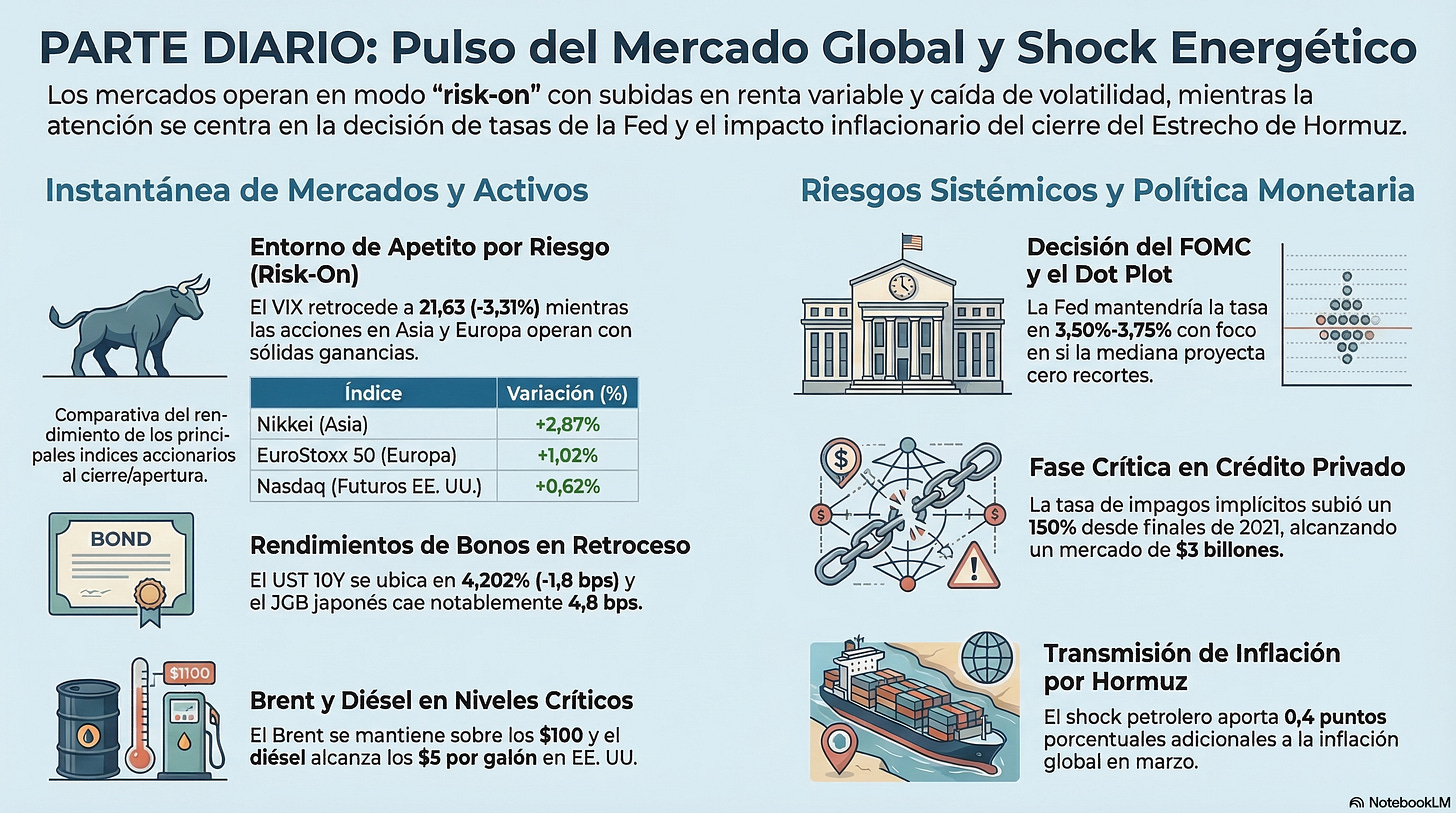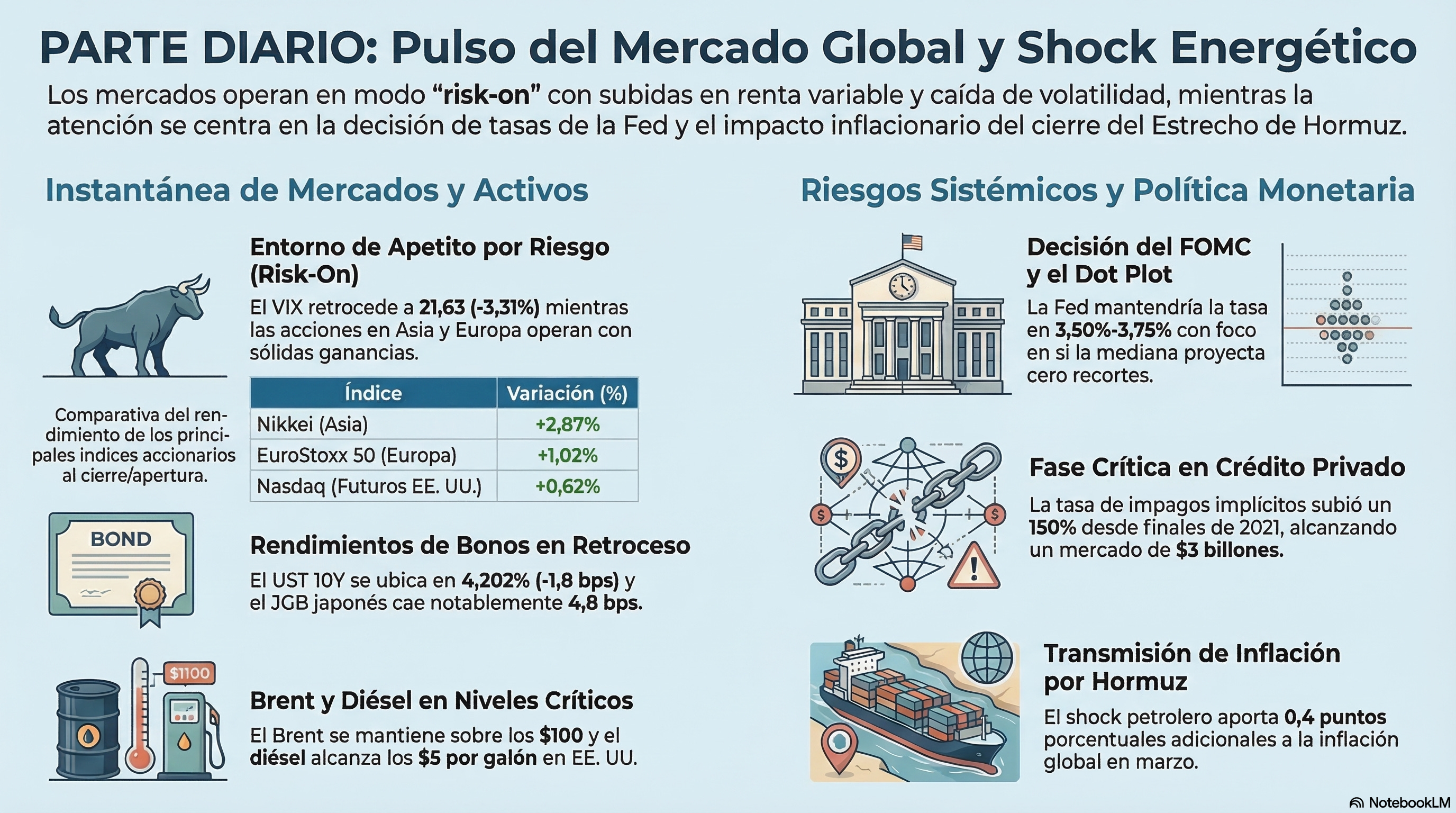 Lectura rápida: La combinación de equities al alza, rendimientos a la baja y un VIX en retroceso configura un entorno de apetito por riesgo que parece descontar un FOMC sin sorpresas esta tarde. Sin embargo, el Brent por encima de los $100 sigue siendo el elefante en la sala: la liberación de reservas estratégicas de Estados Unidos aplana la curva de futuros de petróleo pero no resuelve la restricción física del Estrecho de Hormuz. La caída del JGB 10Y (-4,8 bps) es notable y sugiere que el mercado japonés está recalibrando expectativas de política monetaria ante el shock energético. Para un portafolio global, el riesgo principal no es lo que haga la Fed hoy —la pausa está priceada— sino si el mercado sigue subestimando la persistencia del shock de oferta petrolero y su transmisión a la inflación subyacente en los próximos meses.