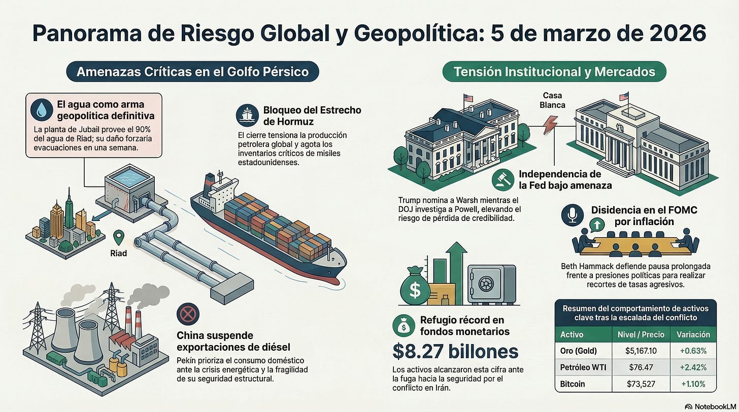 Desalinización como arma geopolítica: Las plantas de agua en el Golfo Pérsico son infraestructura crítica vulnerable a ataques iraníes. Un golpe exitoso contra Jubail forzaría evacuación de Riad en una semana, colapsando estabilidad regional. Vigilar spreads de bonos saudíes y emiratíes, que deberían amplificarse si mercados comienzan a pricear este riesgo de cola aún ignorado.