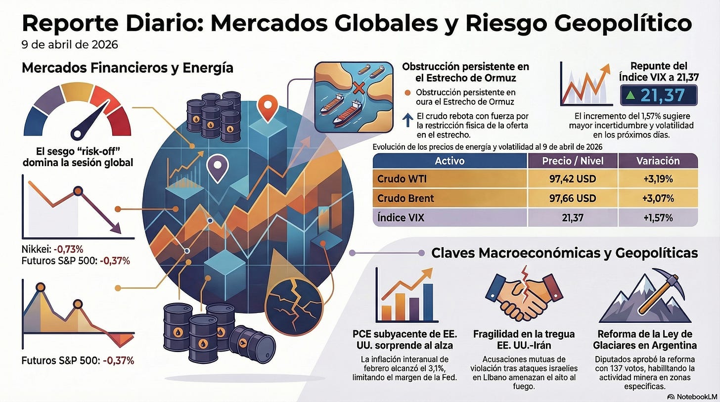 Commodities: El WTI rebota con fuerza a 97,42 USD (+3,19%) y el Brent a 97,66 USD (+3,07%). El gas natural cede marginalmente a 2,72 USD (-0,15%). El repunte del crudo refleja la persistencia de la obstrucción del Estrecho de Ormuz y el riesgo de que la escalada israelí en Líbano descarrile la tregua.