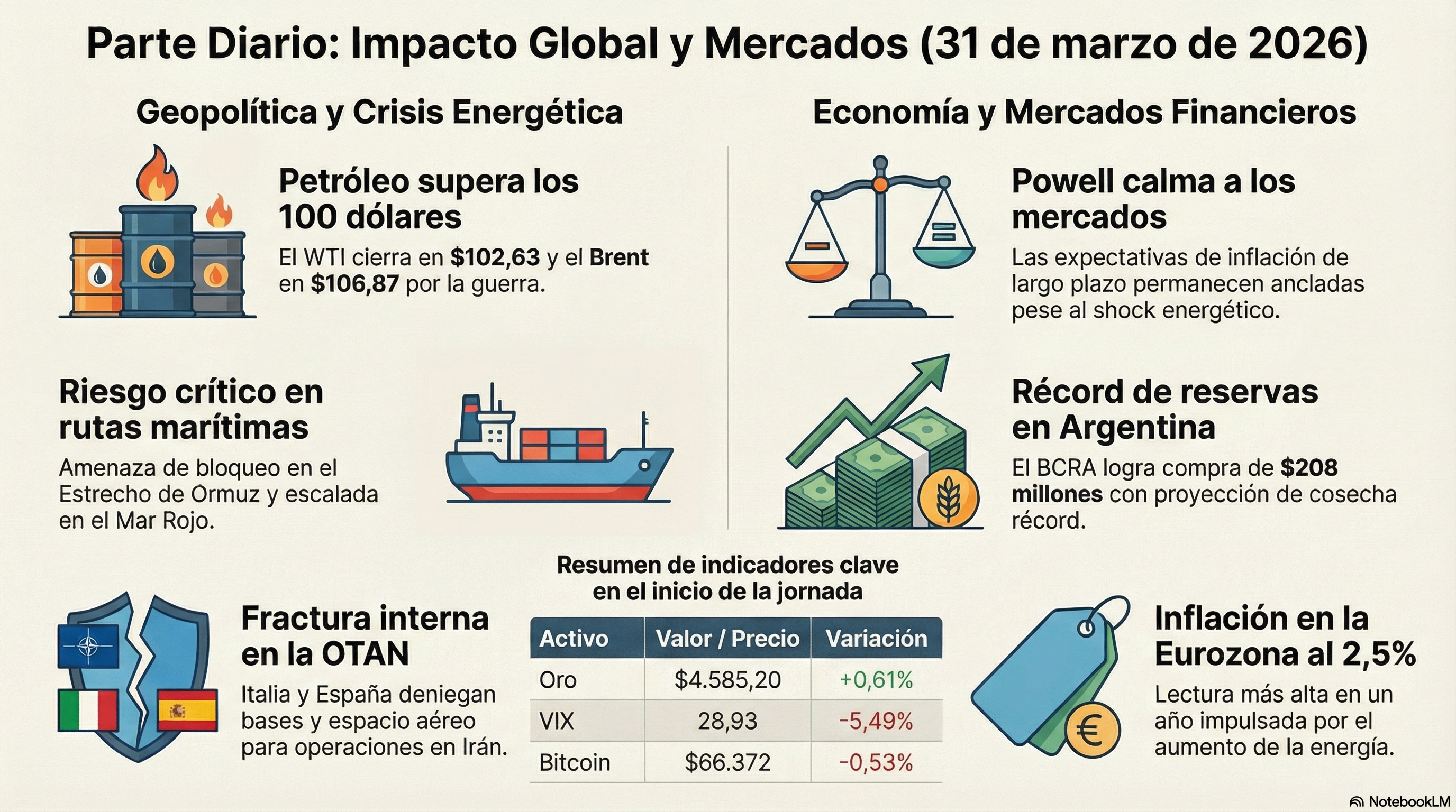 • Petróleo estadounidense cierra arriba de $100 por primera vez desde 2022: La guerra con Irán y la amenaza de escalada de Trump mantienen la presión alcista sobre los precios del crudo, con el WTI superando la barrera psicológica de los tres dígitos.